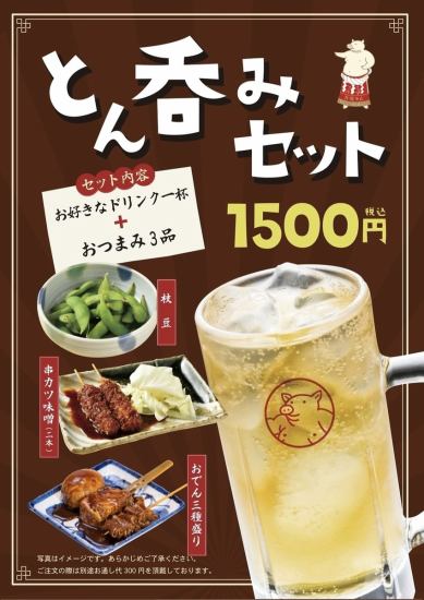 枝豆、おでん三種盛り、串カツ2本のセットとメニューからお好きなドリンク1杯お選びできます。これ一つで昔の矢場とんの名物をお楽しみいただけます!